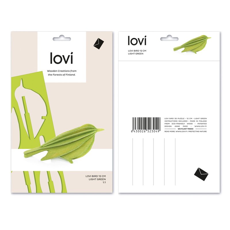 Pagamintas iš tvarios Suomijos beržo faneros, Lovi Mini paukščio ornamentuotas atvirukas yra žavingas dekoro elementas, kuris suteikia šviesų akcentą bet kokiam kambariui. Jo šviesiai žalia spalva perteikia ramybės ir gamtos jausmą, todėl tai yra idealus akcentas įvairiems interjero stiliams.